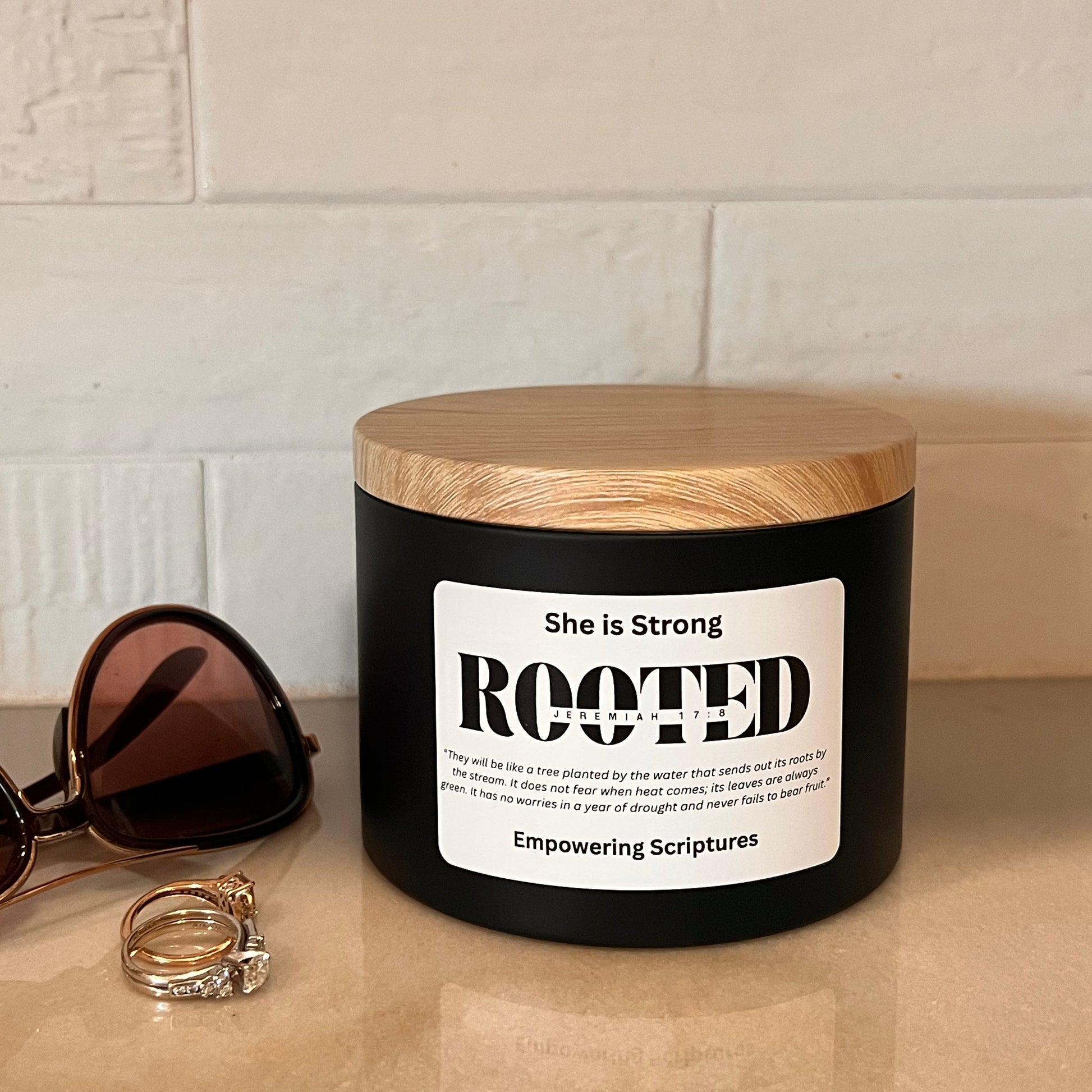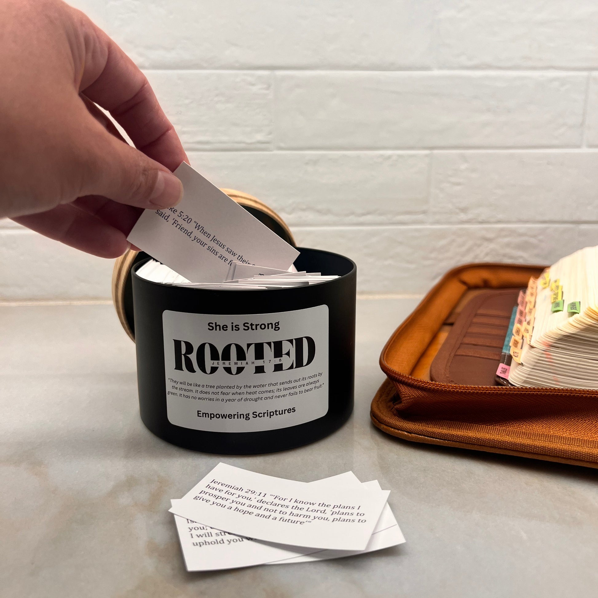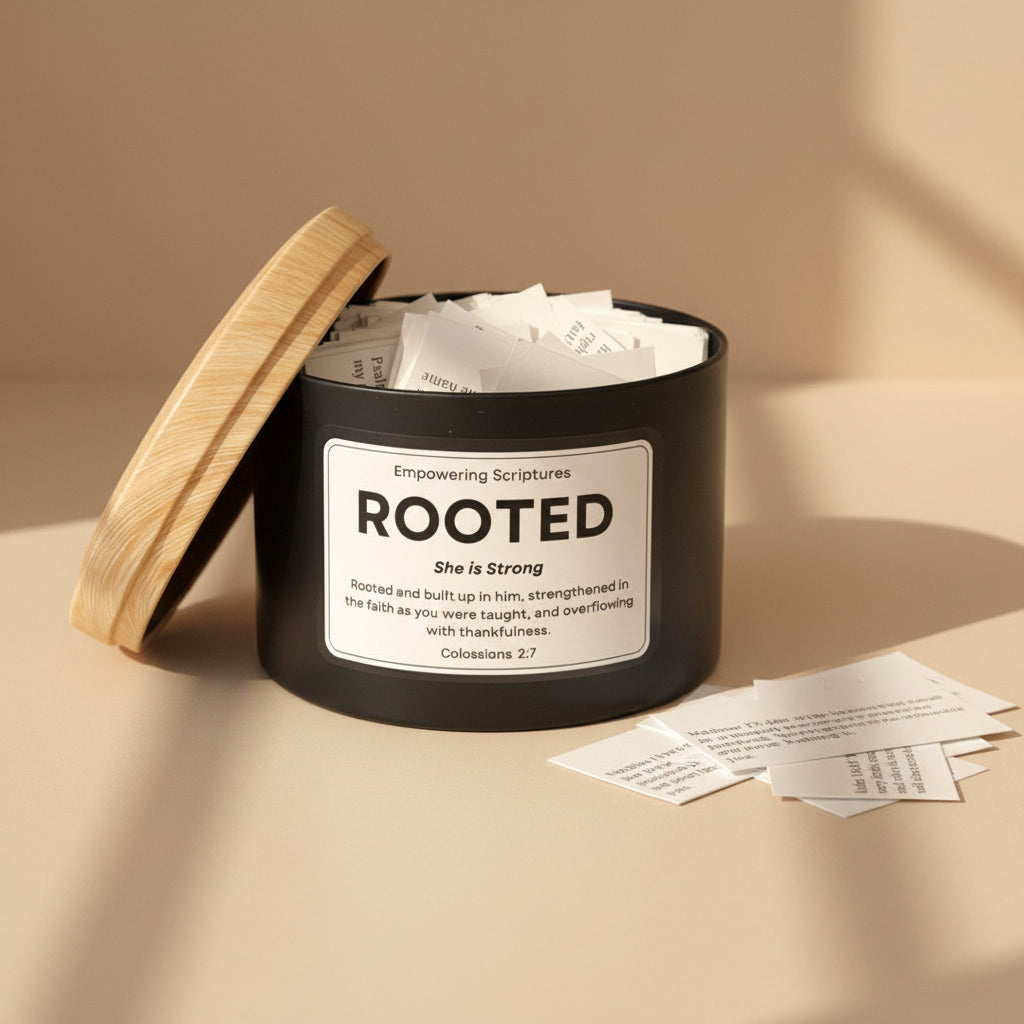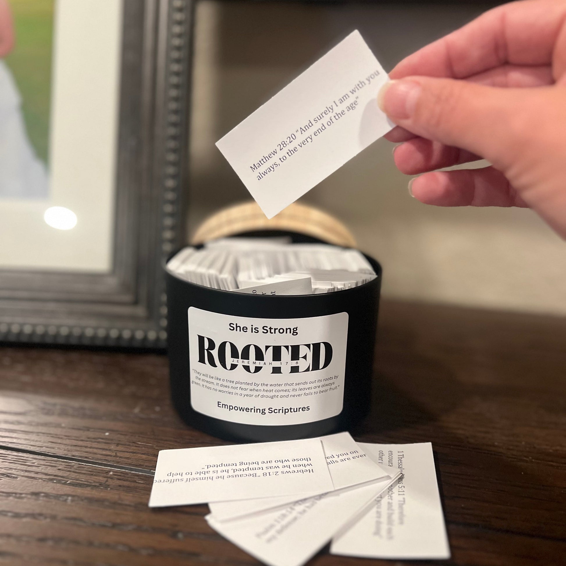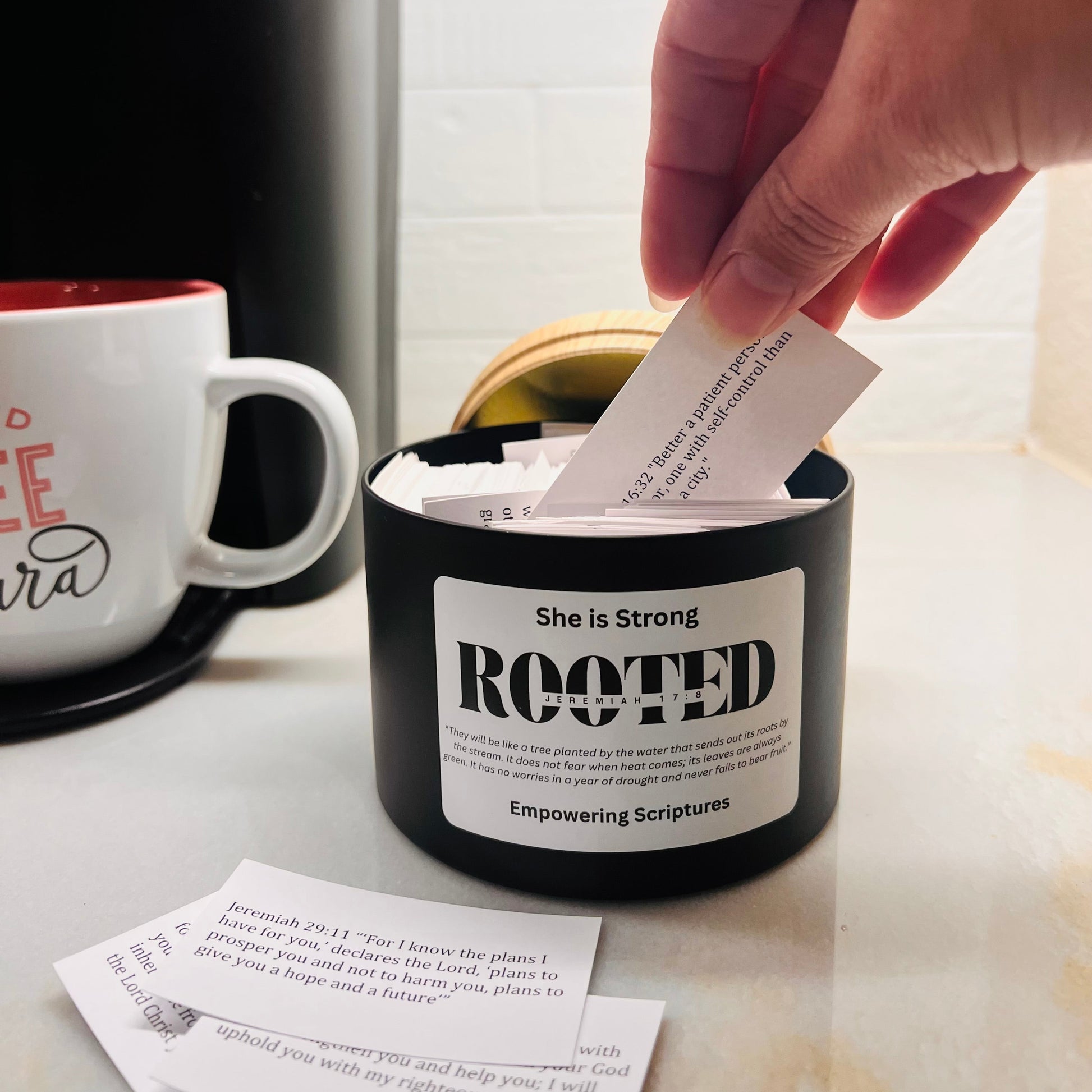 The Rooted She Is Strong Scripture Jar is a faith-based encouragement gift created to uplift women in every season of life. Inside the reusable metal tin are 365 carefully selected Bible verses — one for every day of the year — chosen to speak to identity, courage, peace, worth, and trust in God.